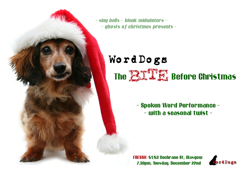 Tomorrow, Tuesday, Fressh (Cochrane St, just along form the south east corner of George Square) from730pm: WordDogs : The BITE Before Christmas. WordDogs Christmas show. Seasonal spoken word entertainment bringing an extra twist to your Christmas crackers. Laughs, ultraviolence, santa caught in a variety of uncompromising positions and genuine Victorian sentimentality (sort of). Recommend the coffee and seasonal cupcakes.