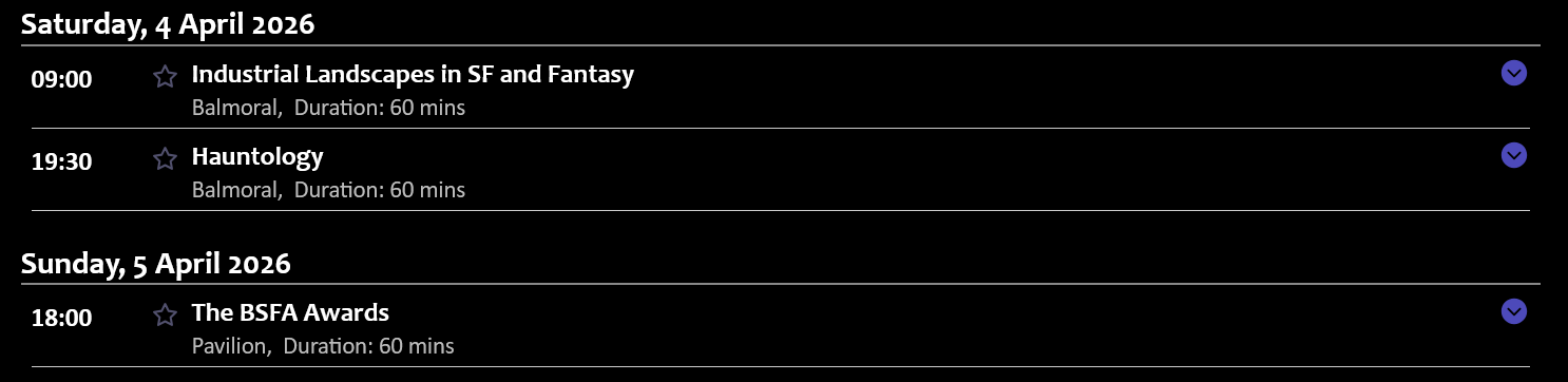 In two weeks’ time I’ll be heading down to Birmingham for the annual Eastercon convention. As always I’m looking forward to four days of hanging about and nerding out. If you’re looking for me, I’ll be on a couple of panels on the Saturday: Industrial Landscapes in SF and Fantasy in the morning, followed by Hauntology later on.